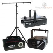 It features 1 RGY laser, 2 NJD Datamoons (with controller), 1 1500W smoke machine and a T-bar lighting stand.
